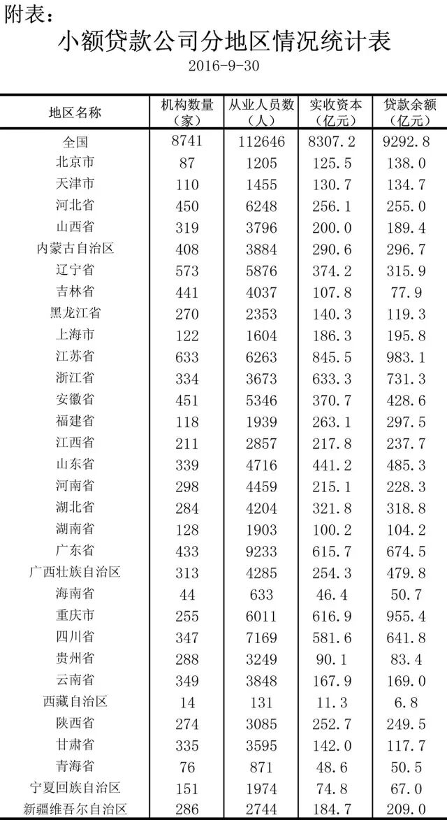10月25日,央行发布三季度小额贷款公司统计数据报告。报告显示,截至2016年9月末,全国共有小额贷款公司8741家,贷款余额9293亿元,前三季度人民币贷款减少111亿元,实收资本8307亿元,从业人员112646人。